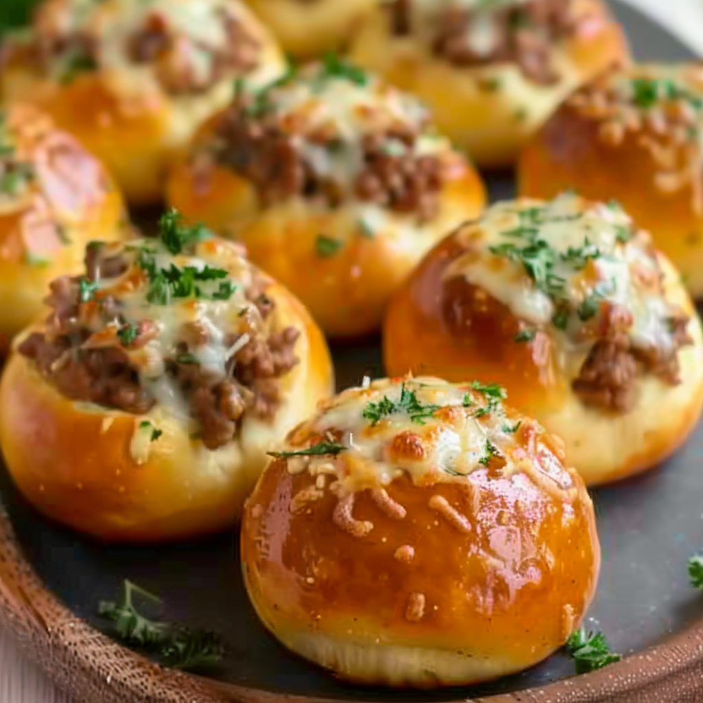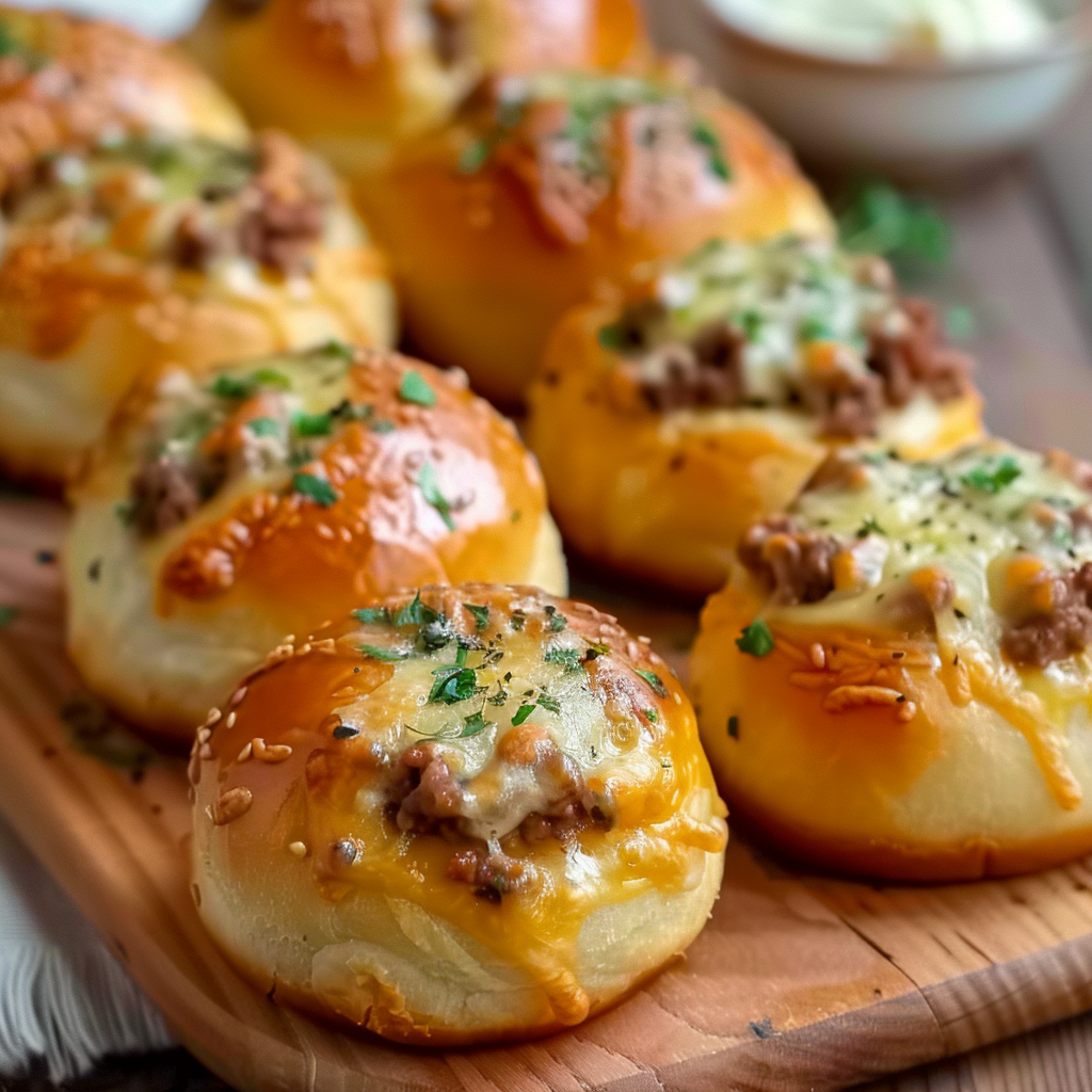 The structure of these bombs allows for a flavor-packed experience in every bite. Each one contains seasoned ground beef, cheddar cheese, and is sealed with dough that becomes light and fluffy on the inside while crisping up beautifully on the outside. The finishing touch? A generous brush of melted garlic butter mixed with Parmesan cheese, giving each bomb a burst of rich, buttery, and slightly salty flavor.