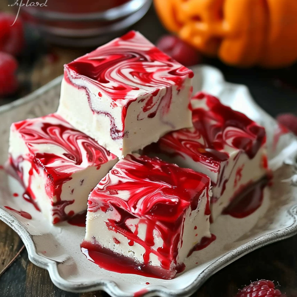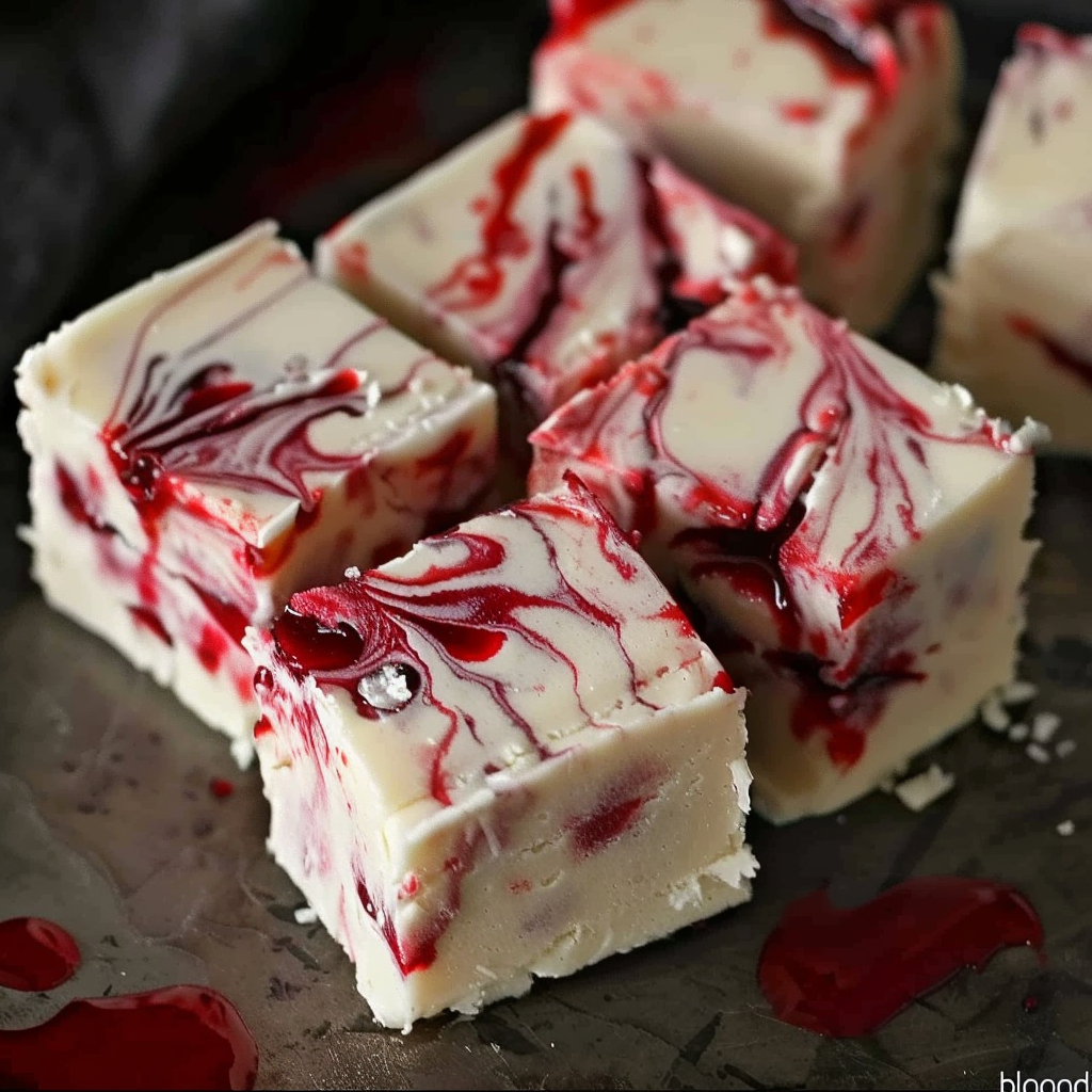 The recipe is simple but delivers major visual and flavor impact. The base layer blends white chocolate chips, sweetened condensed milk, and vanilla extract with shredded sweetened coconut for a tropical-meets-sweet base. Then comes the spooky centerpiece: a ribbon of blood-red raspberry jam, colored with red gel food dye for that eerie vampire effect. Topped with more coconut fudge, it sets into a sliceable tray of sweet horror.