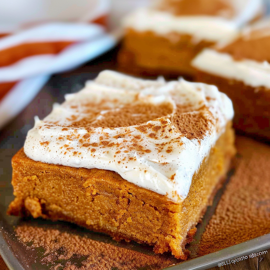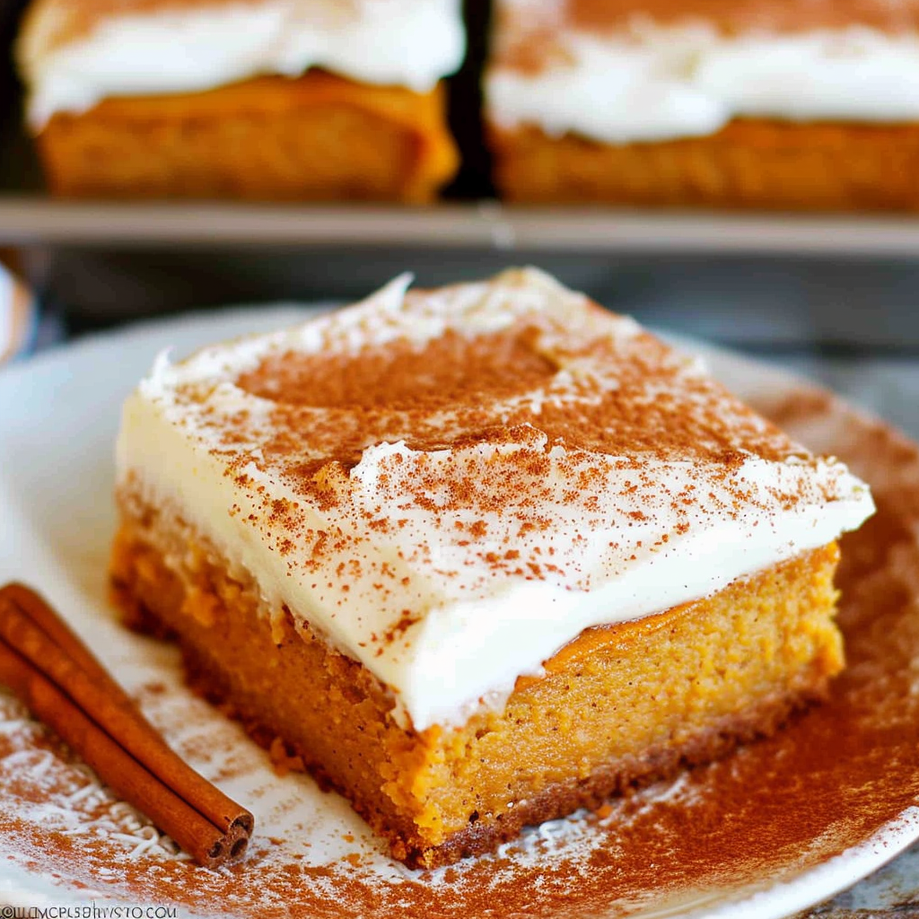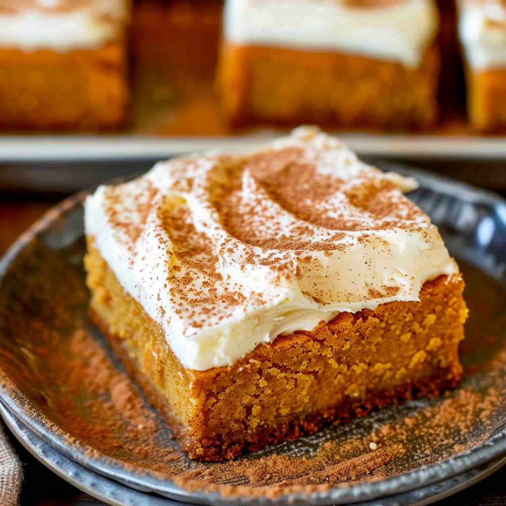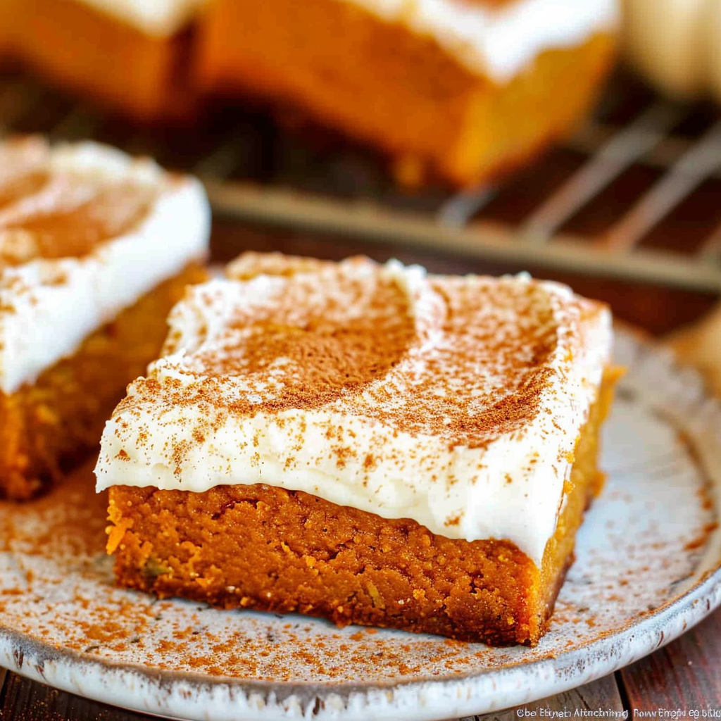 Their soft, cake-like texture is infused with warm cinnamon and pumpkin spice, evoking all the nostalgic flavors of fall. The addition of a tangy cream cheese frosting elevates each bite with a creamy contrast that perfectly complements the spiced base. These elements make the bars not only delicious, but also visually appealing—ideal for festive holiday tables and dessert spreads.