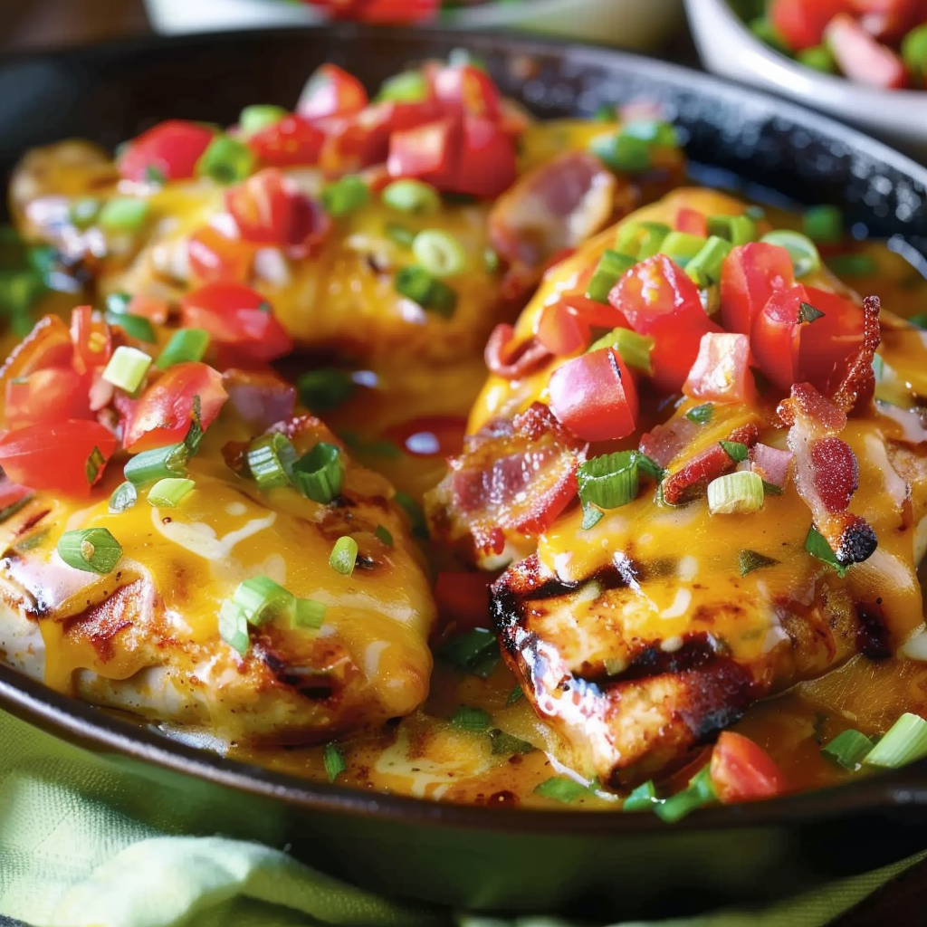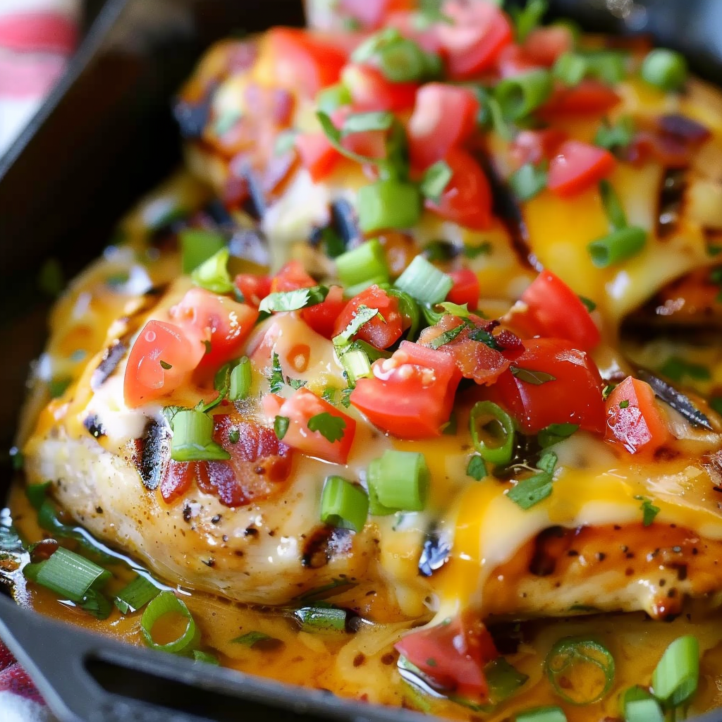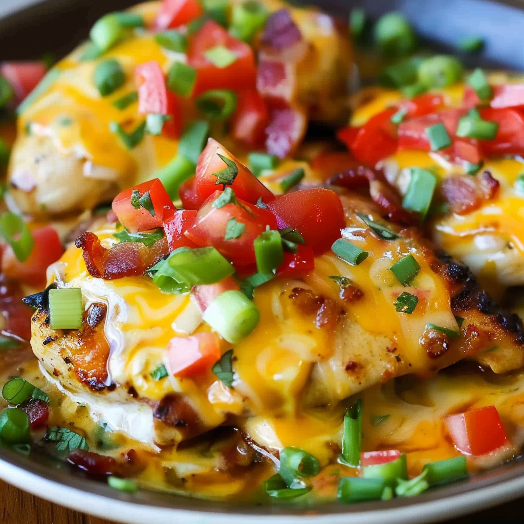 Monterey Chicken is a bold, flavor-packed dish made with juicy chicken breasts, smoky BBQ sauce, crisp bacon, and melted Monterey Jack cheese, finished with fresh diced tomatoes and green onions. Whether baked or grilled, this recipe delivers a satisfying, restaurant-style experience right at home. Perfect for weeknight dinners, cookouts, or meal prep, it’s customizable, easy to make, and always a hit.