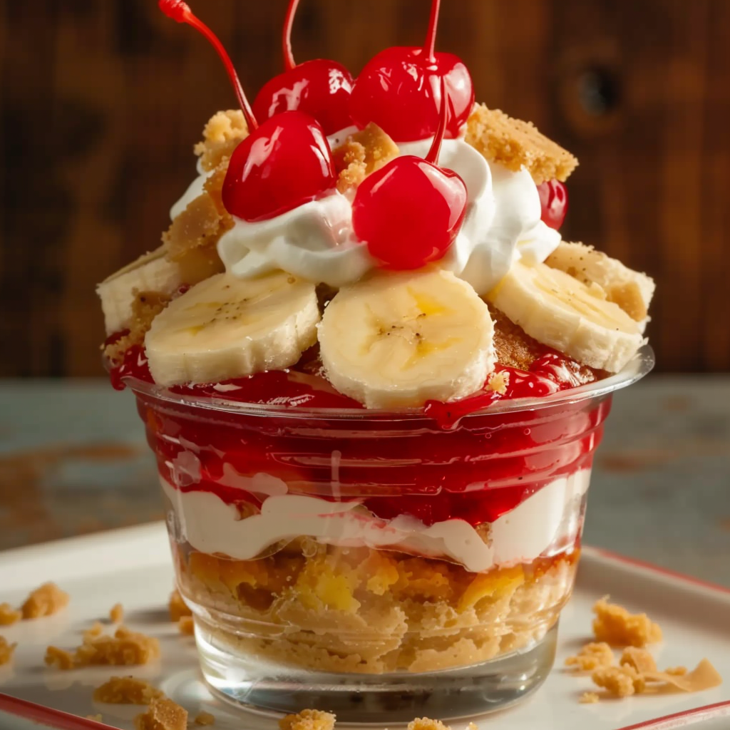 This dessert is a twist on several classics — it merges the nostalgic flavors of banana pudding and strawberry shortcake, while borrowing texture and presentation ideas from cheesecake cups. What makes it stand out is how easy it is to layer these familiar flavors into individual portions that look stunning and taste even better. The contrast between the creamy filling, the soft cake, and the crunchy topping creates a multi-textured experience that feels like a layered trifle in cup form.