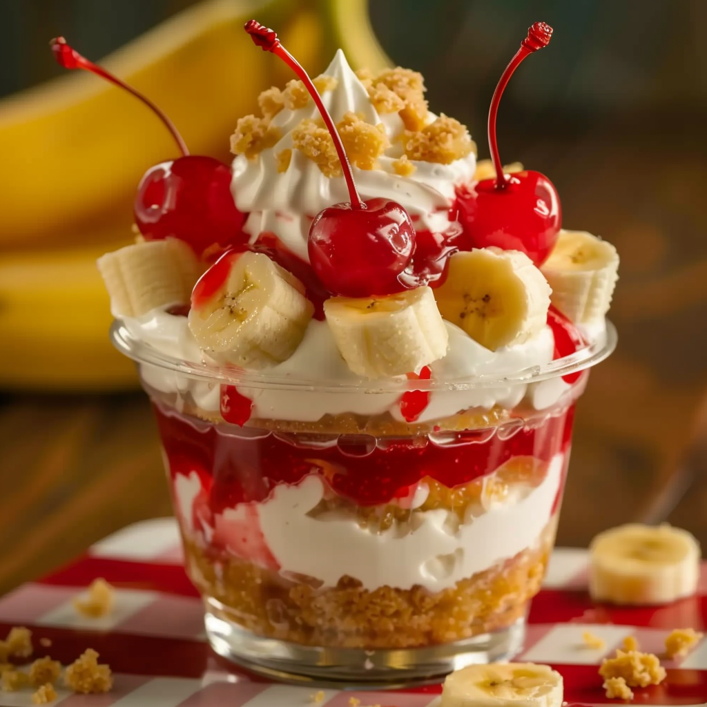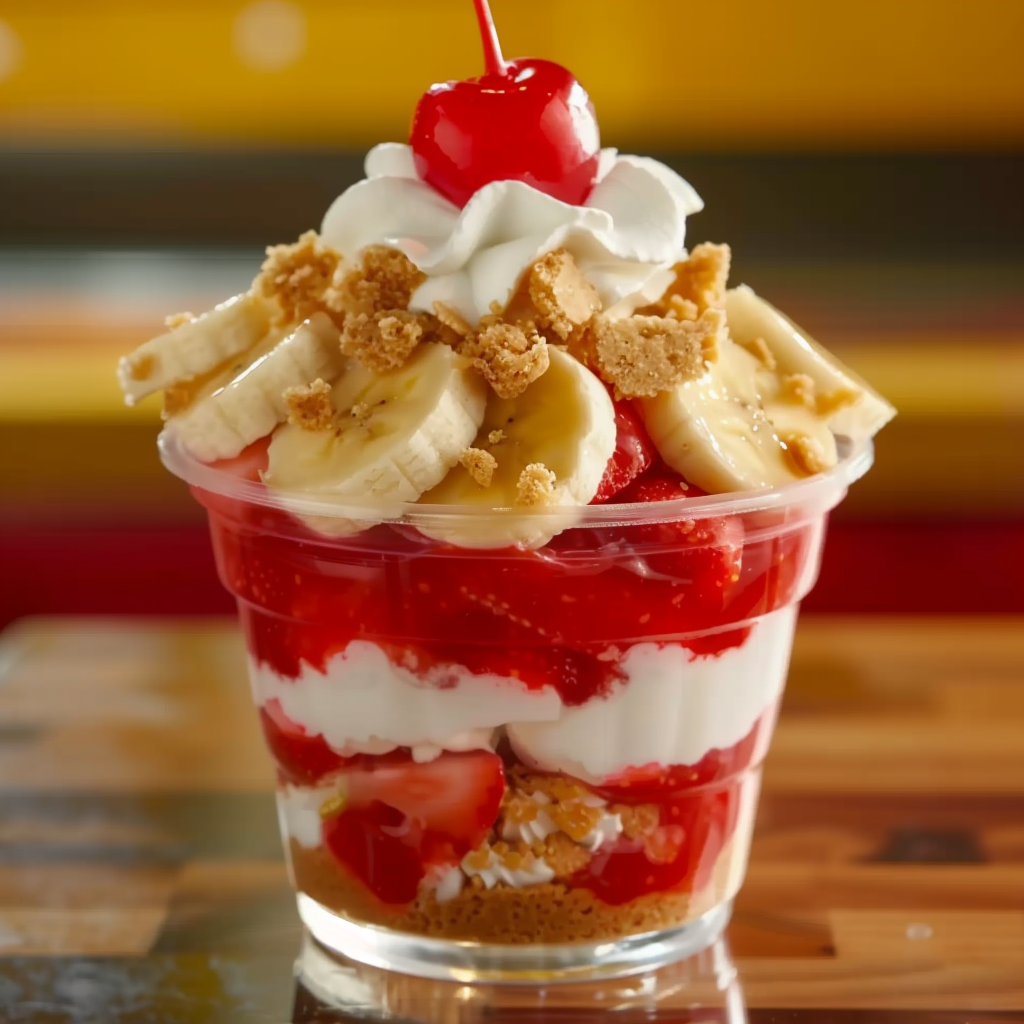 This dessert is a twist on several classics — it merges the nostalgic flavors of banana pudding and strawberry shortcake, while borrowing texture and presentation ideas from cheesecake cups. What makes it stand out is how easy it is to layer these familiar flavors into individual portions that look stunning and taste even better. The contrast between the creamy filling, the soft cake, and the crunchy topping creates a multi-textured experience that feels like a layered trifle in cup form.