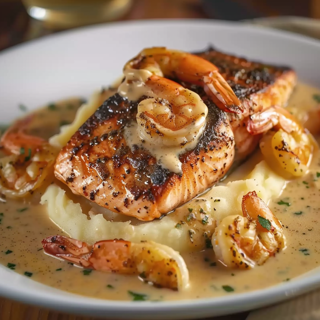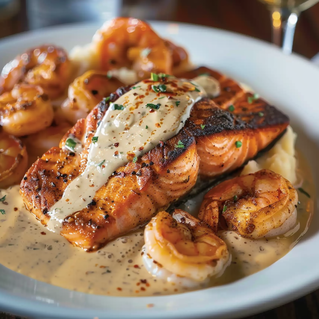 Balanced textures and flavors – Crisp-edged salmon, tender shrimp, and pillowy mashed potatoes come together with a velvety Cajun cream sauce to tie it all together.