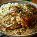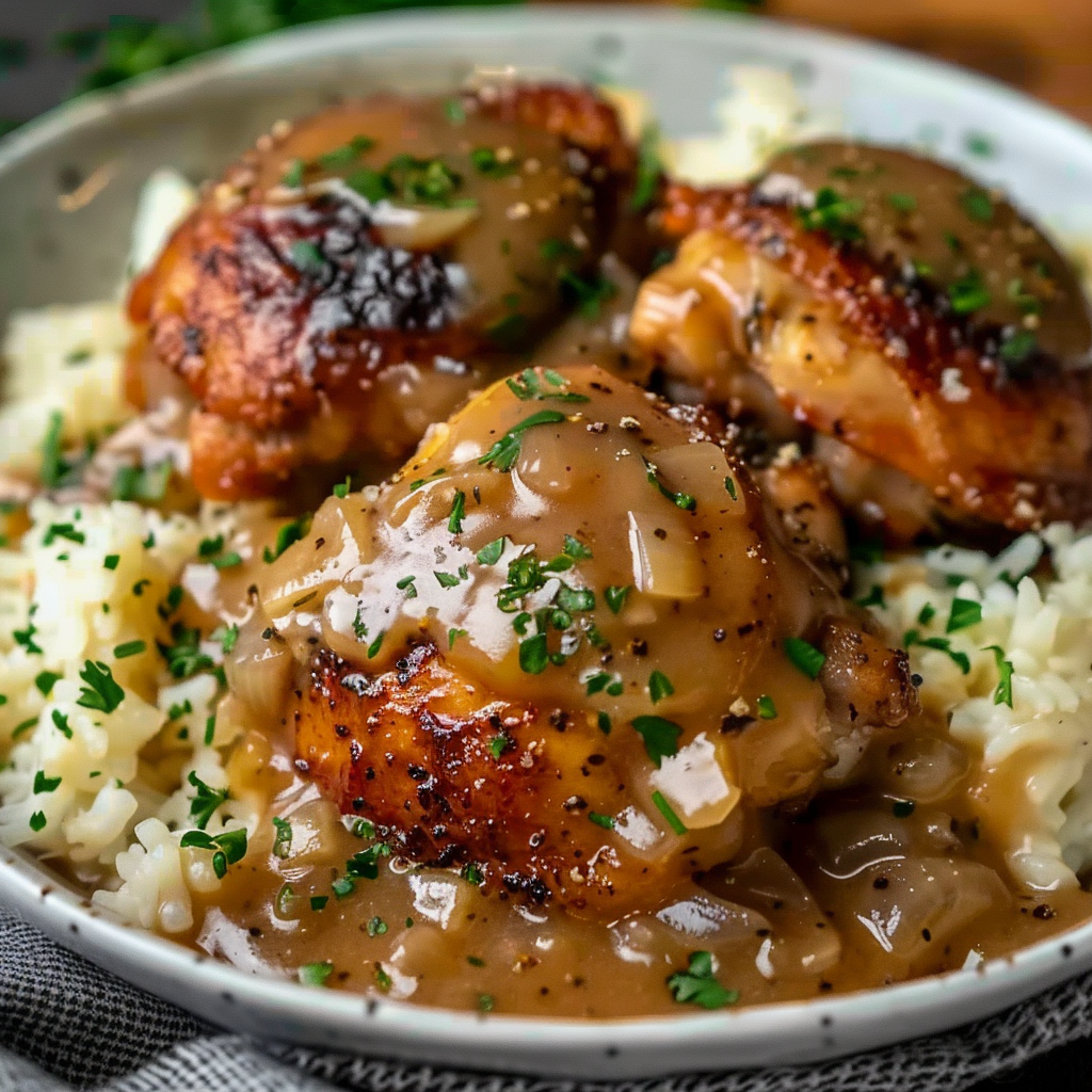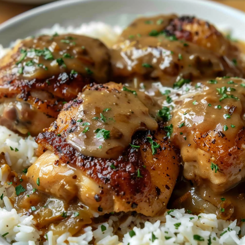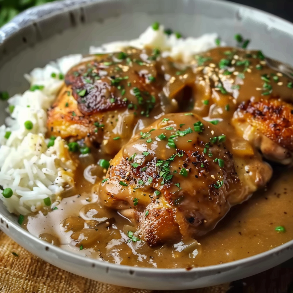 Southern Smothered Chicken Thighs with Onion Gravy is a timeless one-skillet comfort meal featuring boneless chicken thighs simmered in a rich, creamy onion and garlic gravy. Seasoned with classic spices and finished with a touch of thyme and heavy cream, this dish brings the soul of the South to your table. Perfect over mashed potatoes or buttered rice, it’s hearty, flavorful, and ideal for family dinners or special occasions.