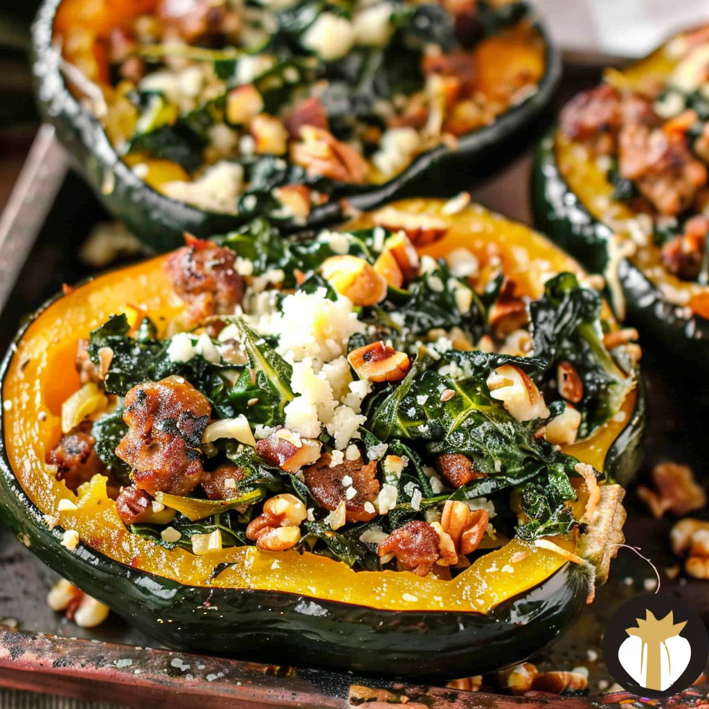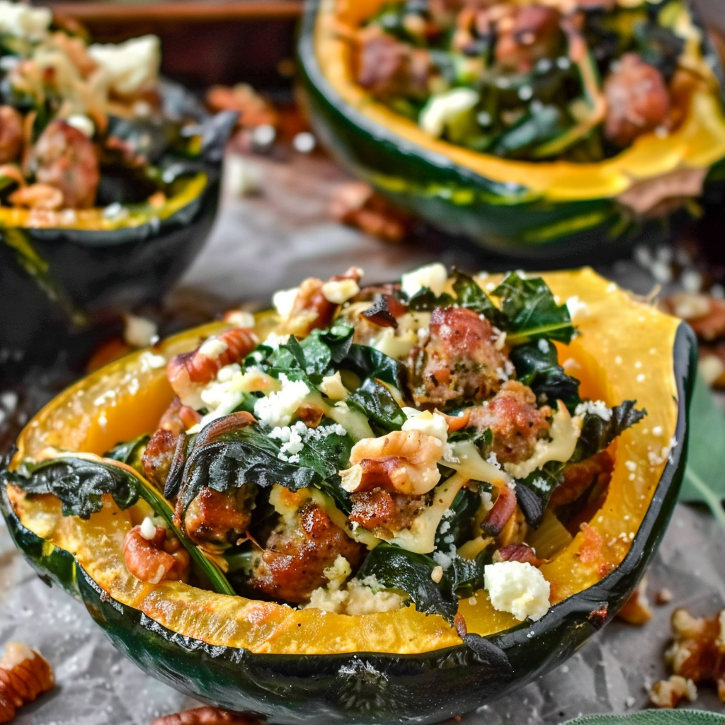 Keep dinner simple with this sausage and wild rice stuffed acorn squash—a cozy, hearty meal that celebrates the best of fall. Roasted squash halves are filled with a savory blend of sausage, aromatic vegetables, apples, cranberries, and herbs, then topped with melted cheese for the ultimate comfort food experience. Perfect for family dinners, make-ahead meals, or a festive holiday centerpiece.