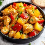 3️⃣ Add veggies and fruit: Scatter sliced bell peppers and pineapple chunks over the chicken and sauce.