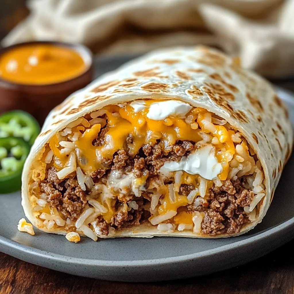 What makes this Beefy Melt Burrito so satisfying is the balance of textures and flavors: the beef is savory with a hint of chili, the rice adds heft, the cheese sauce brings gooey richness, sour cream adds tang, and the tortilla strips provide that unexpected snap. If you like heat, a drizzle of your favorite hot sauce or a few pickled jalapeños take it up a notch. Best of all, each component can be prepped ahead—cook a big batch of rice, brown and season the beef, and then assemble burritos on demand.