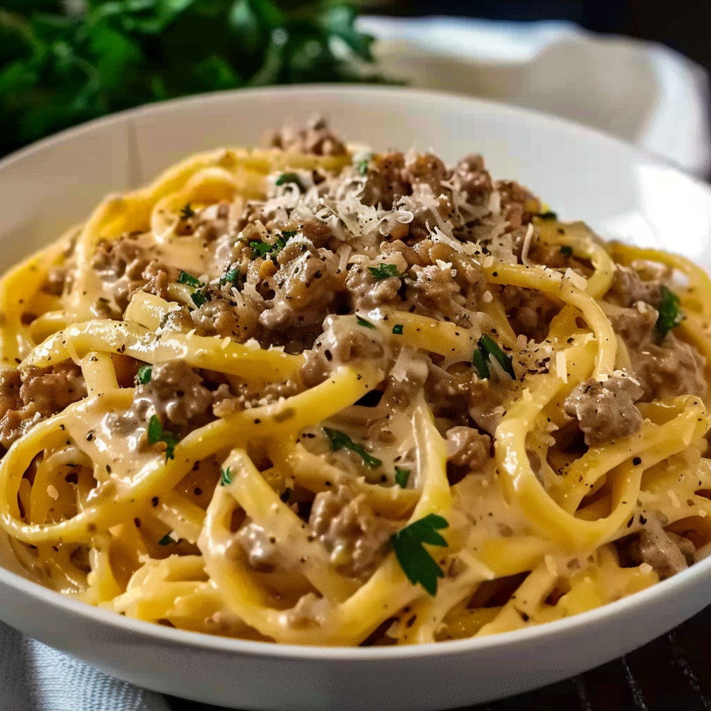Level up your weeknight dinner game with Creamy Parmesan Garlic Butter Linguine with Beef. This rich and satisfying pasta dish features tender linguine tossed in a luscious garlic butter sauce, thickened with heavy cream and enriched with Parmesan cheese. Juicy ground beef adds a hearty bite, while Italian seasoning and fresh parsley round out the flavors. Ready in under 30 minutes, it’s the perfect one-pan meal for when you need something easy, comforting, and packed with flavor.